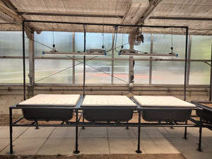 The deep water culture raft boards are supported by the edge of the grow bed and sit just above the water line providing air to the plant roots. Each DWC bed has 32 planting spaces in the rafts. These beds are great for high density production of many types of lettuces, herbs and greens such as: